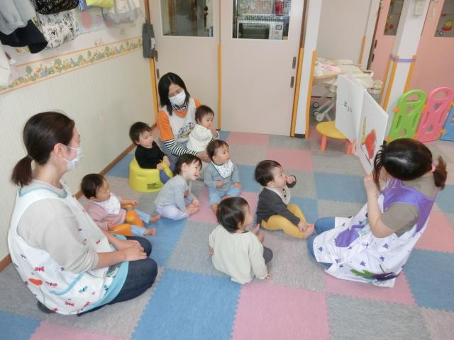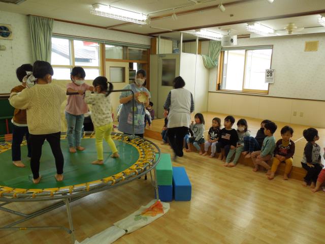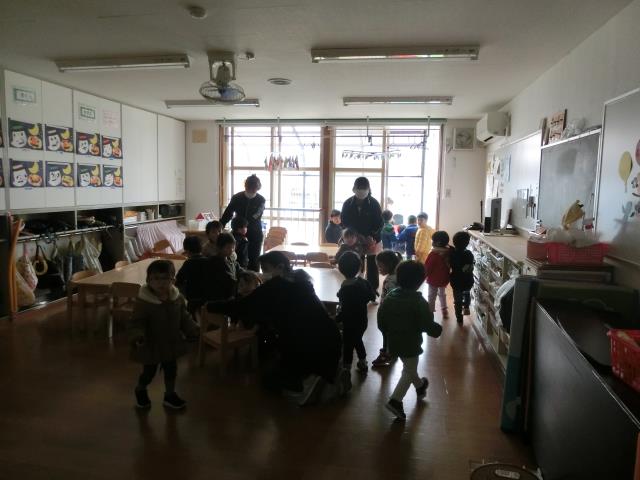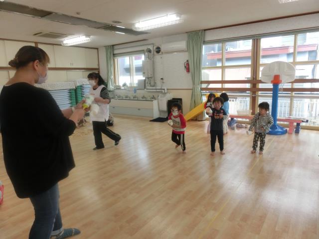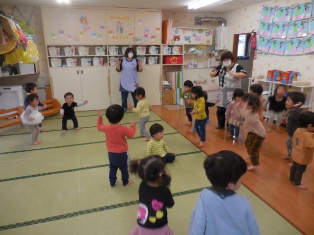 ひよこぐみは、みんなが大好きな『だるまさんが』と『だるまさんと』の大型絵本を見た後、運動あそびをしました。