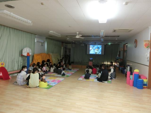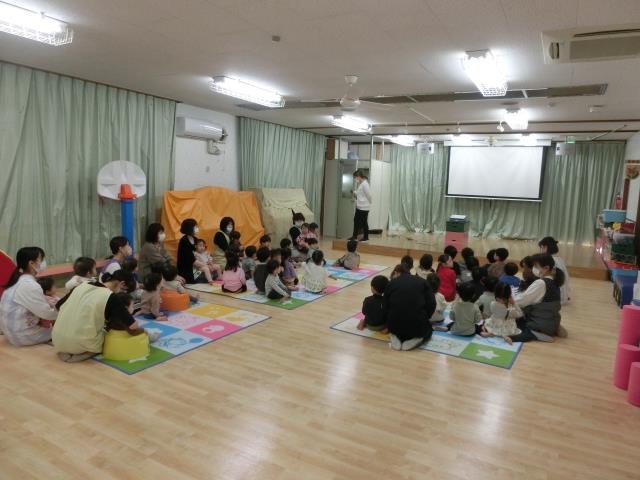 2部に分かれて、ひよこ・つくし・たんぽぽぐみは『ぼくは小象の消防隊』、ちゅうりっぷ・さくら・すみれぐみは『やめて!ライターあそび どうぶつ村の消ぼう隊 出どう』を観ています。