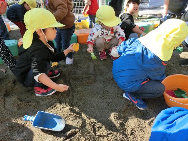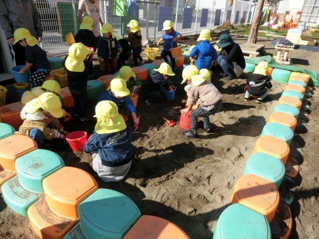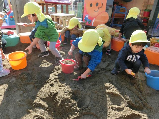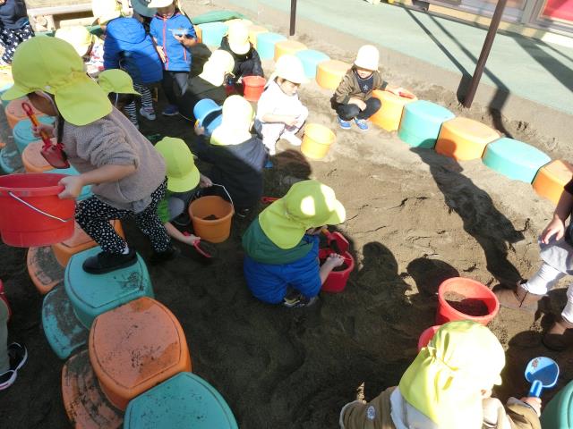 今日のたんぽぽぐみは、砂場あそびを楽しんでいます。