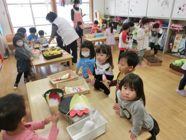 ごっこ遊びは、クレープ屋さんやコッペパン屋さんなどがあり、お店屋さんやお客さんになってとても楽しそうに遊んでいました。