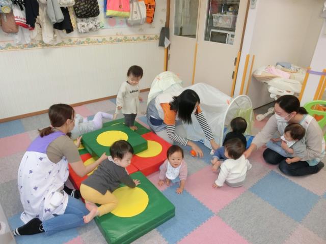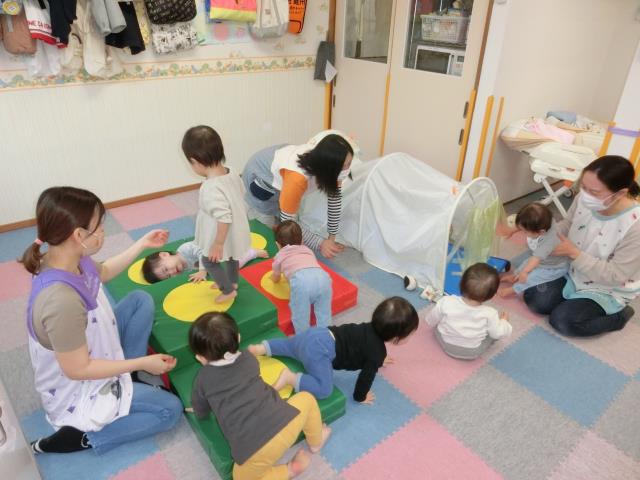 JPクッションとトンネルで遊び、トンネルにすずらんテープのカーテンをつけ、「ばぁ~」と覗いたりしてみんな楽しそうでした♪