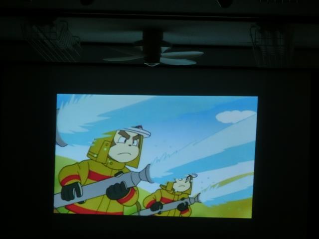 園庭への避難の後は、ホールへ移動し火災に関するDVDを鑑賞しています。