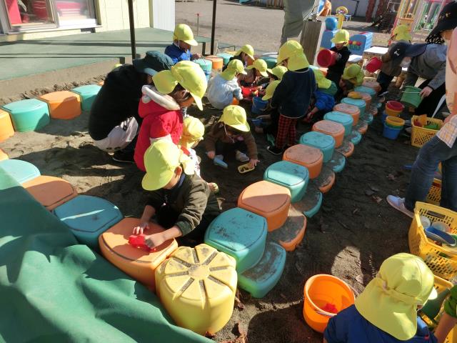 お山を作ったり、ご飯を作ったり、型を使ったりと前回よりも自分達で考えながら遊んでいましたよ!