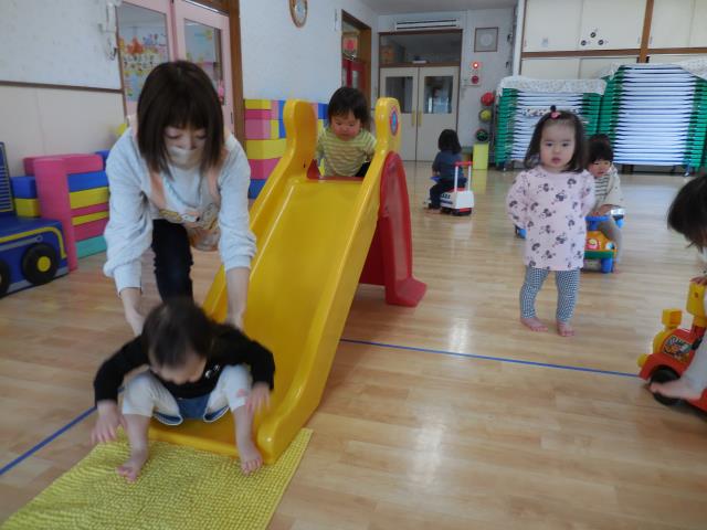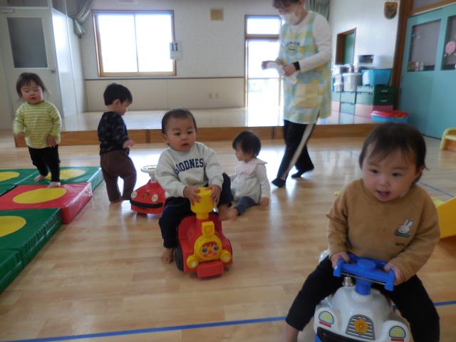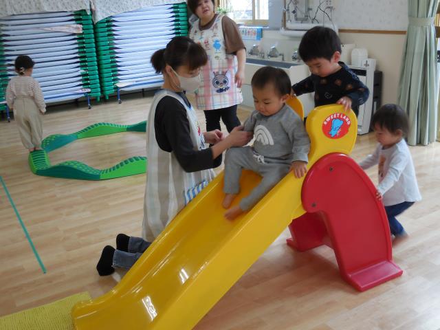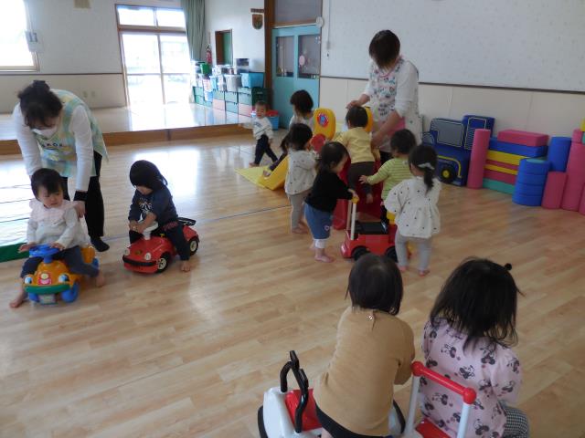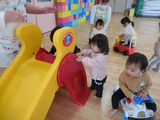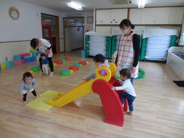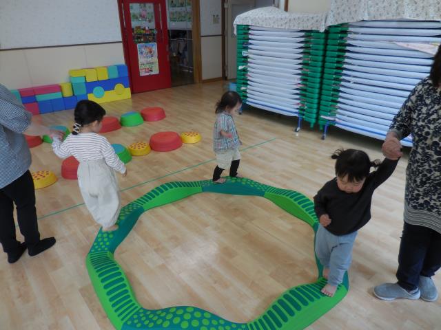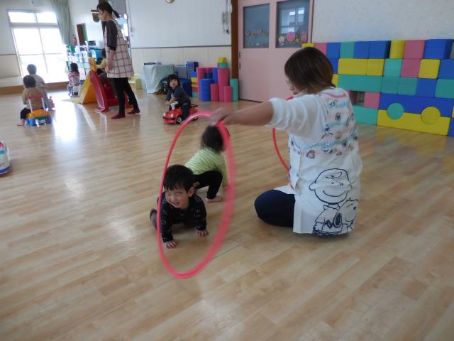すべり台を滑って楽しんだり、お友だちと足こぎ車に乗ってホール中を回って喜んだり、JPクッションの跳ねる感触を楽しみ、フラフープくぐりにも挑戦しています。