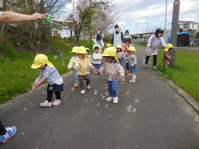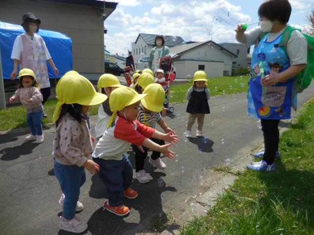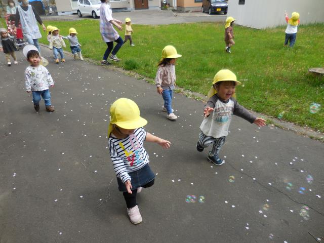 しゃぼん玉あそびもし、追いかけたり手で触ろうと伸ばしたりして、大喜びしながらしゃぼん玉を追いかけて楽しんでいました。