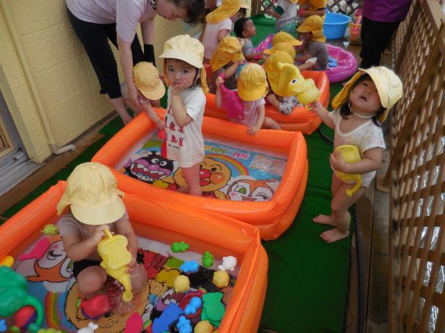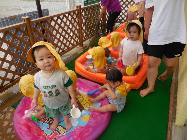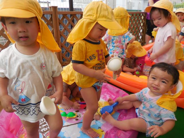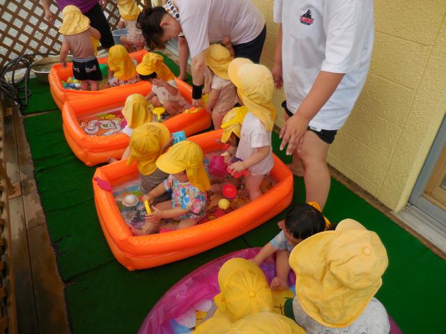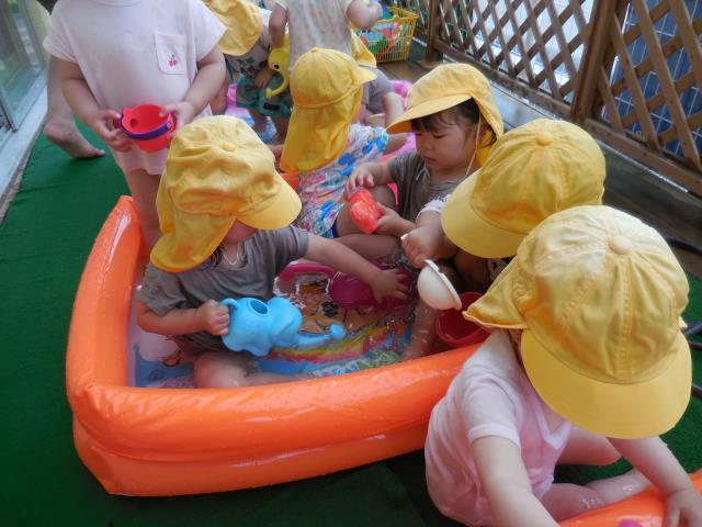 みんな喜んでビニールプールの中へ入り、ジョーロやお魚さん等の玩具を使って楽しんでいます。