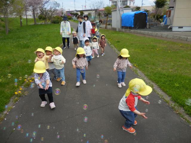 大好きなしゃぼん玉を飛ばすと、大盛り上がりで追いかけていたつくしぐみさんでした。