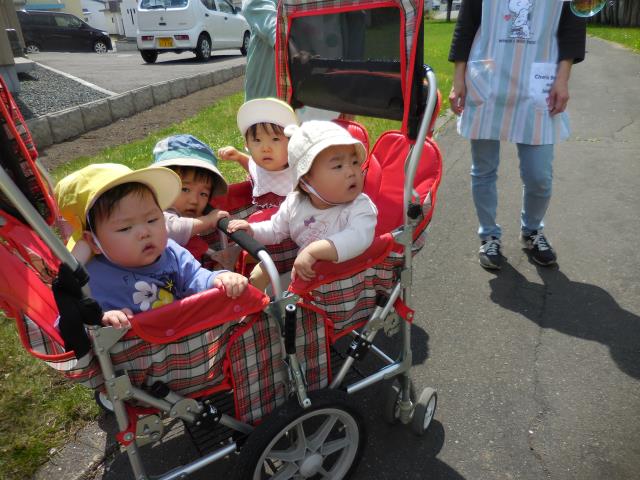 ベビーカー・お散歩カー・歩く子と分かれ、みんなで行っています。