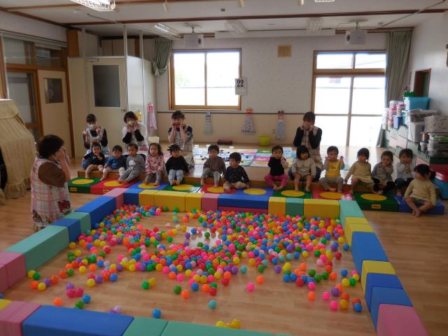 今日のつくしぐみは、すべり台やバランスストーン・ボールプール・手作り玩具などを使い、ホールで遊んでいます。