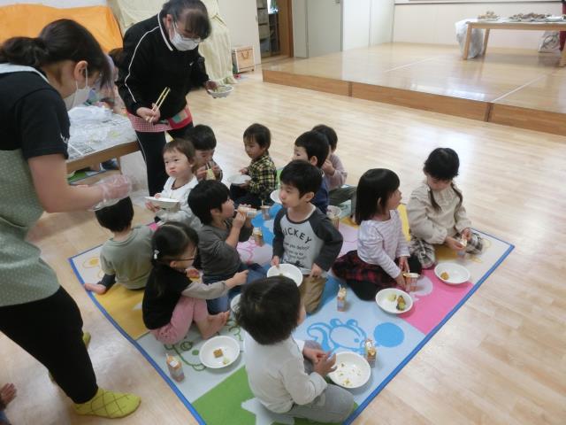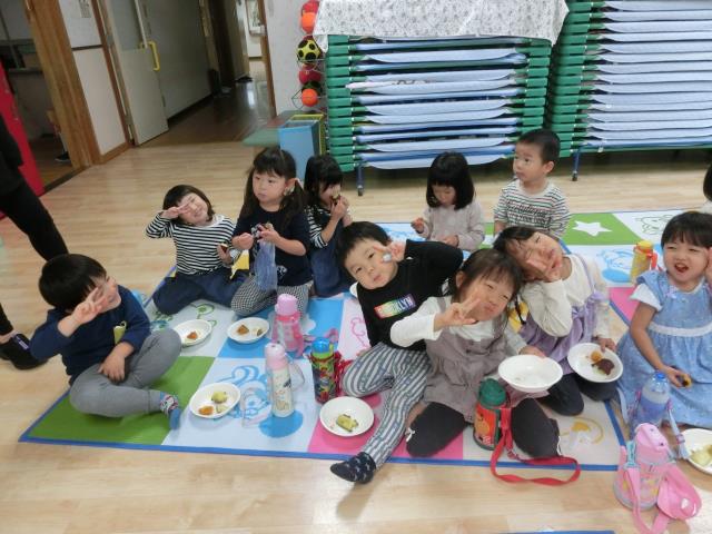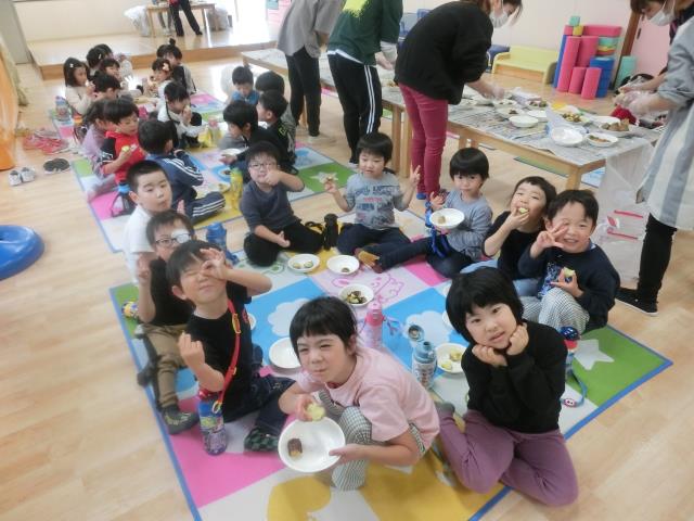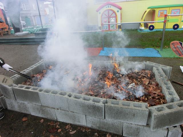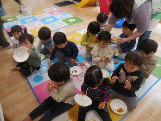本来ならば皆で園庭に出て落ち葉をかけたり、お芋を入れたりするのですが、本日は残念ながら雨ということで、先生方がやきいもを作り、子ども達はホールやお部屋にて秋の味覚を味わっています。