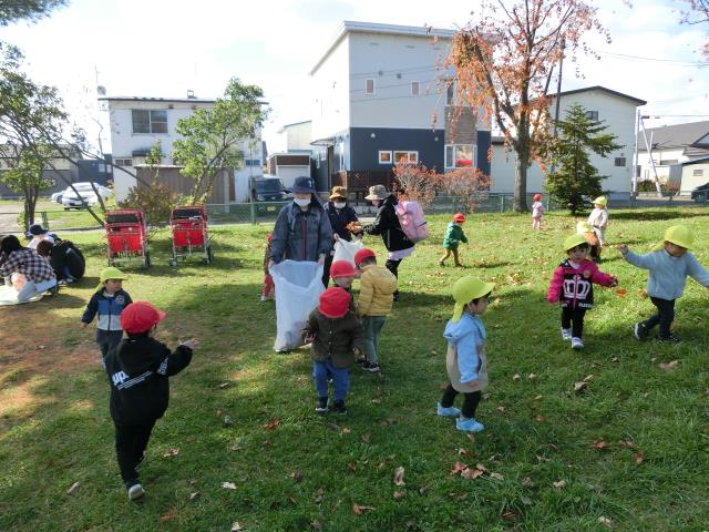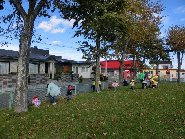 両手いっぱいに落ち葉を抱えて袋に入れる子、一枚一枚葉っぱの形や色を見て楽しむ子と様々でした。