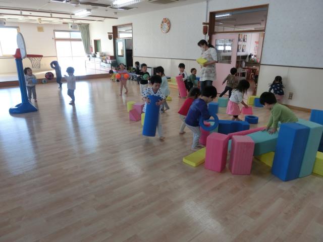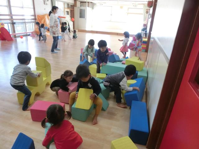 その後、ホールに行ってカラー積み木とボールを使った遊びも楽しんでいます。