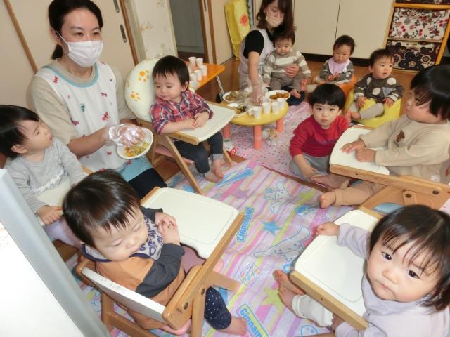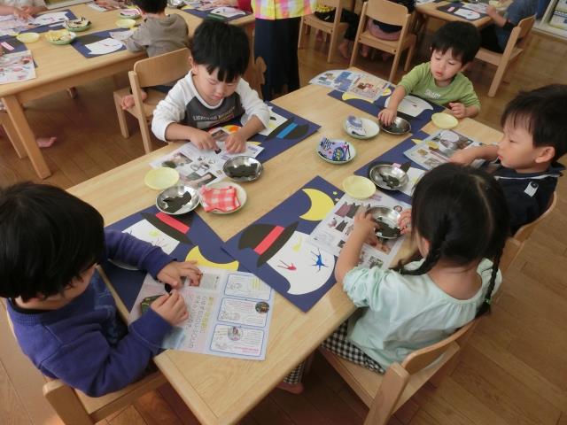 今年は残念ながら雨が降り、園庭で食べる事は出来ませんでしたが、お友だちと楽しいおしゃべりをしながらモリモリ食べていましたよ!