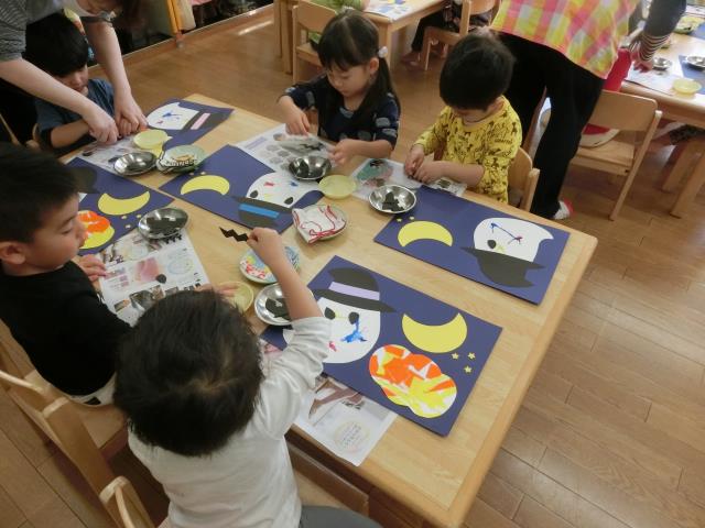 以前作ったおばけとかぼちゃに、目・鼻・口をのりで貼り完成させました。