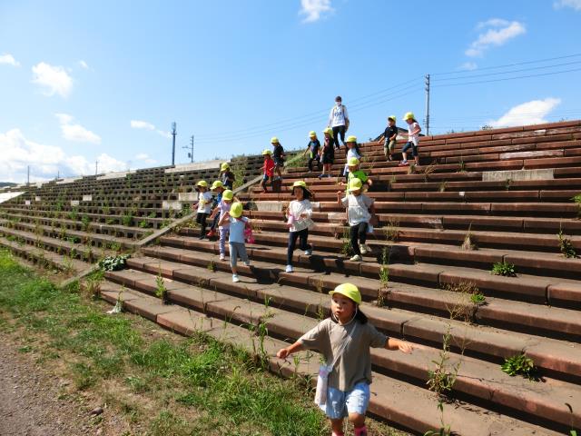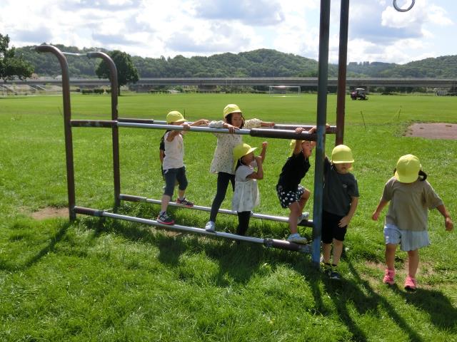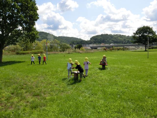 今日のすみれぐみは、河川敷を通って少し休憩してから、白樺公園に行って遊んできました。