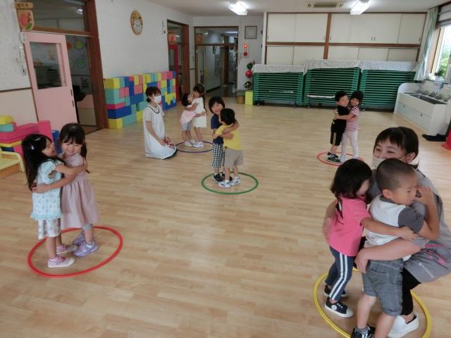 1つ目は、ピアノに合わせて歩き、タンバリンが鳴ったら2人ずつフラフープに入り、あたまかたひざポンを歌って、最後にギューッとくっつくゲーム。
