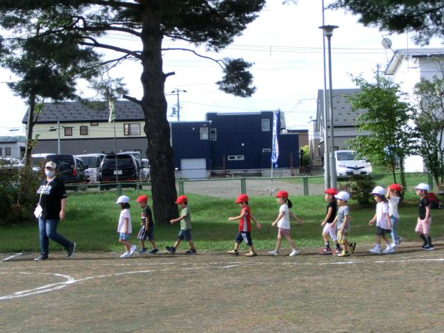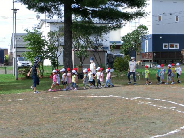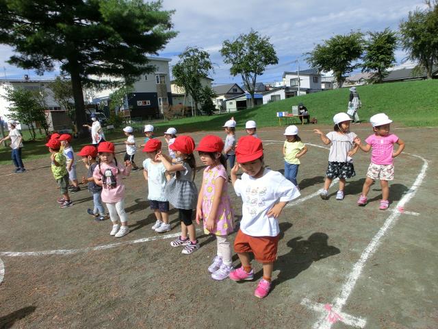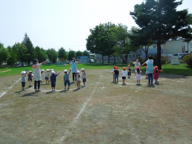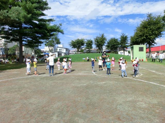 園長先生のお話を聞いた後、皆で盆踊り(こども盆踊り・サンバ北見ばやし)を踊っています。