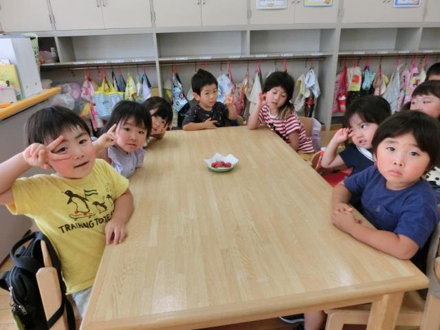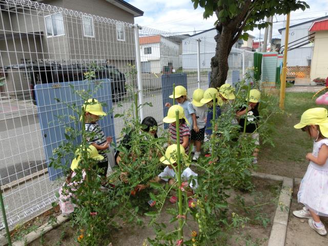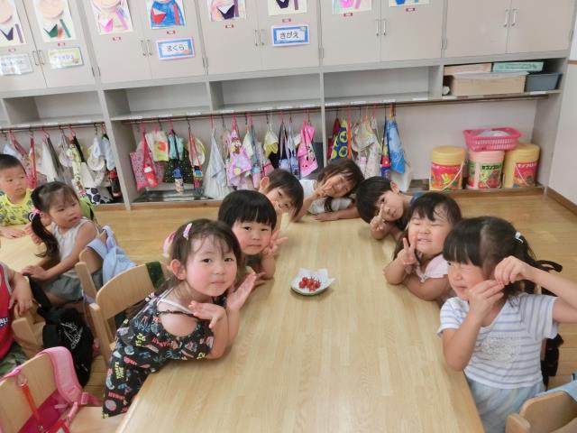 5個のトマトができ、どんな風に収穫するのか見学し、その後みんなで分けて食べました。