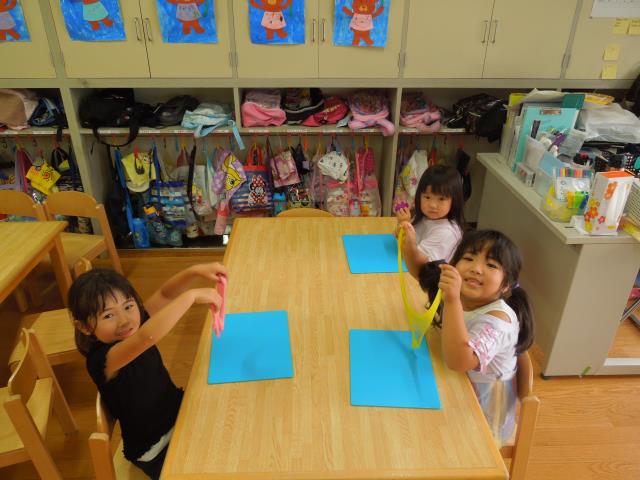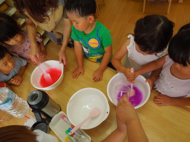 「スライム作り」では好きな色を選び、自分達で混ぜて作りました。
