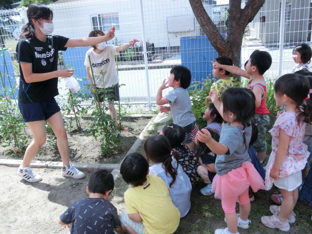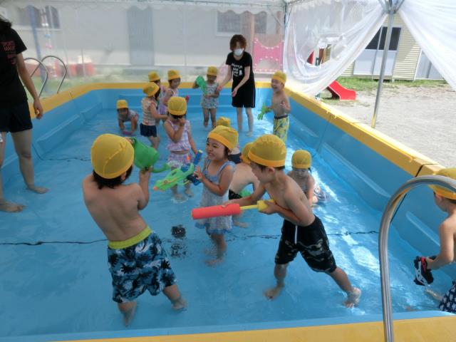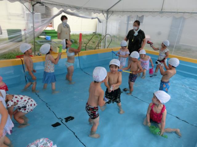 どの子も水鉄砲やじょうろを持ち、水の掛け合いを楽しんでいましたよ。