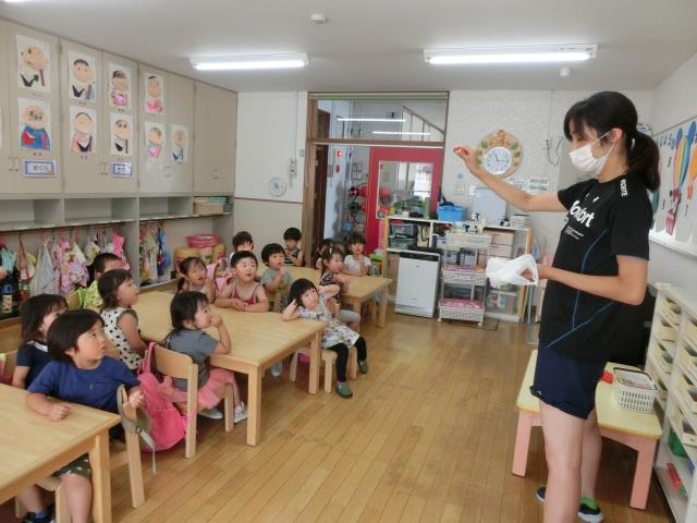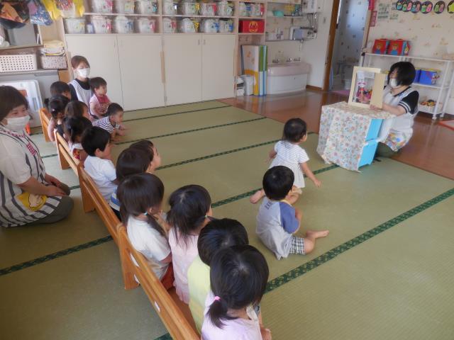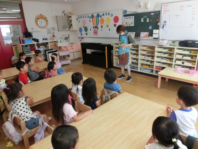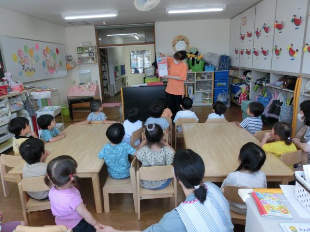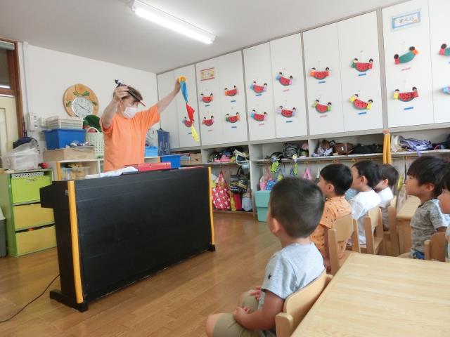 先生の出し物ペープサート「アンパンマン」のキャラクター当てクイズをすると、みんなノリノリで「あんぱんまん!」「ばいきんまん!」と答えていました。