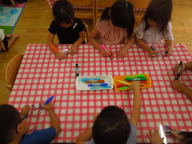 「プラバン作り」では、好きなキャラクタ―を選び、色をペンで塗っていきました。