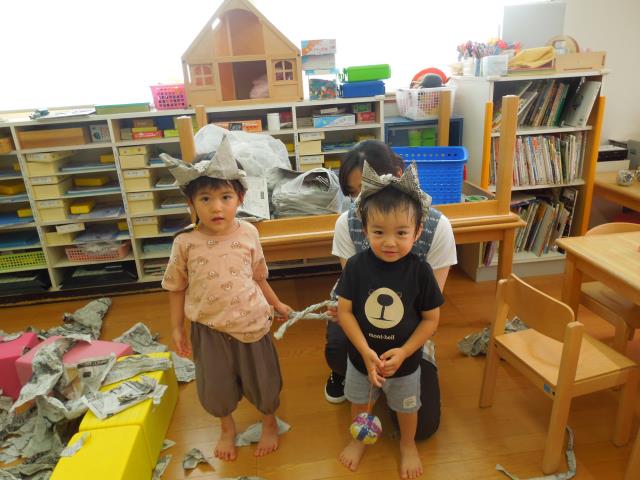 「新聞紙遊び」は、大きな新聞プールの他に、ヨーヨ―やおばけ叩きゲームなど、盛り沢山で楽しめたようです。