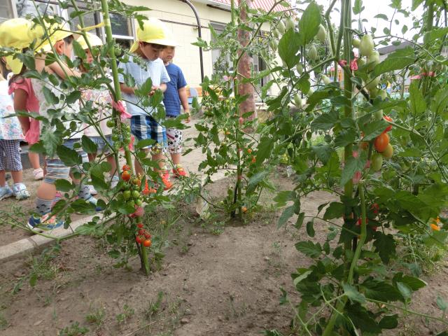 みんなで順番に、赤やオレンジのトマトを採りました。
