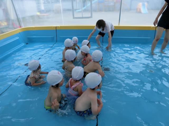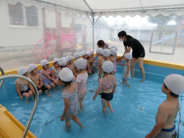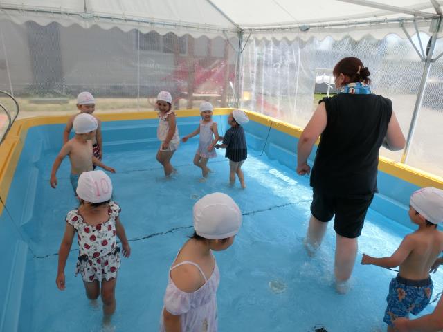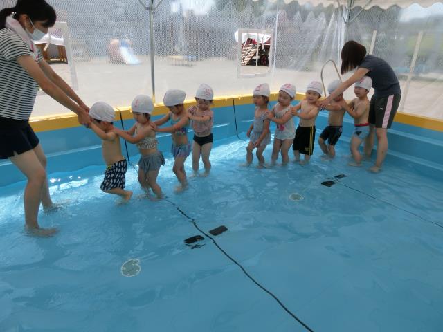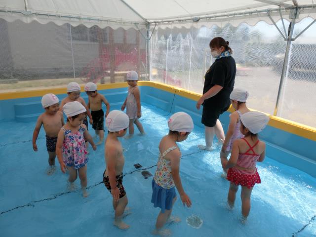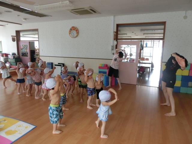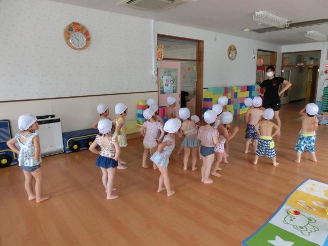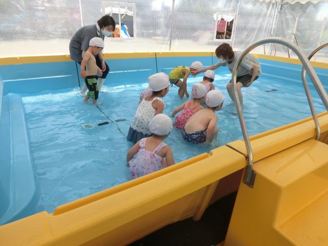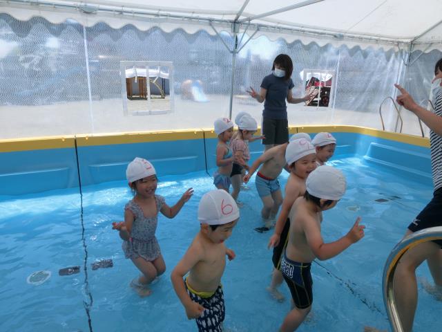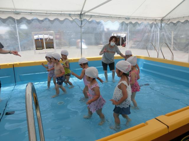 カニ歩きやアヒル歩きをしたり、体に水をかけたりしながら、楽しんでいた子ども達です。