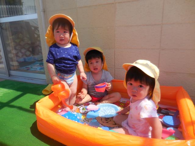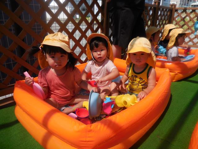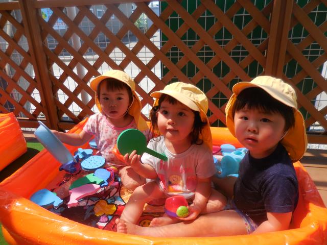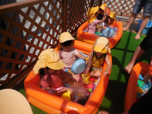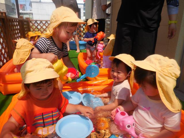 後半になるとだんだんと遊びがダイナミックになり、手でバチャバチャして水の感じを楽しんだりして遊び、楽しんでいたつくし組の子ども達です。