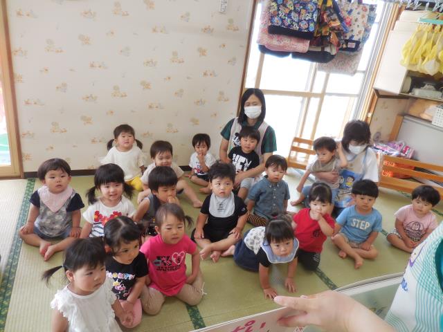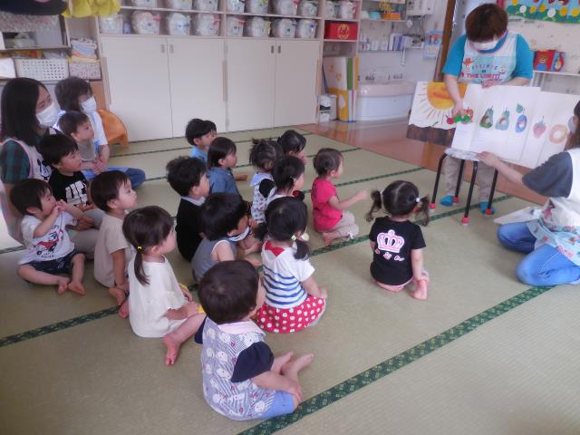 その後は大型絵本『せんたく母ちゃん』を見た後、実習生の先生との交流もかねてフルーツバスケットをして楽しんでいます!!