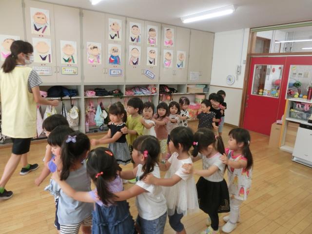 その後は、『あくしゅでこんにちは』の歌遊びと『じゃんけん列車』をして楽しみました。