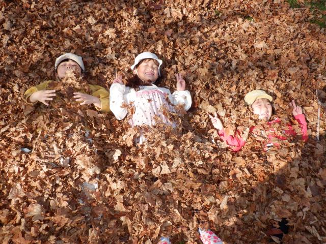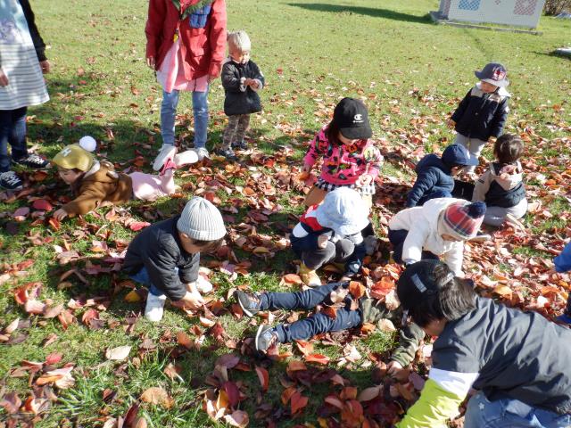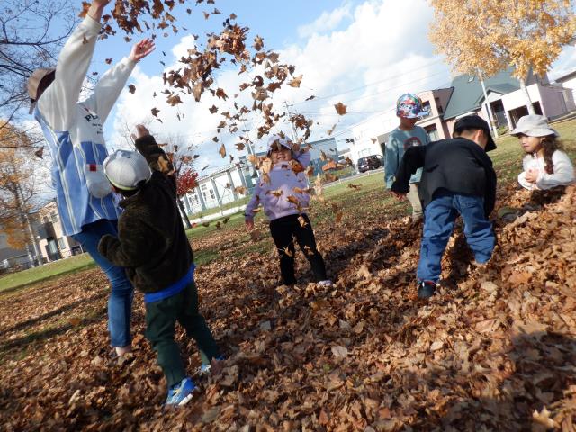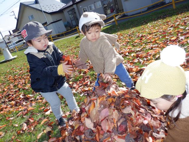 到着すると、しらかば公園も落ち葉がたくさんあり、お友達と埋もれながら楽しんでいました。