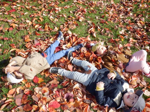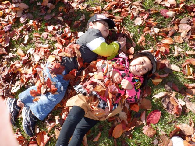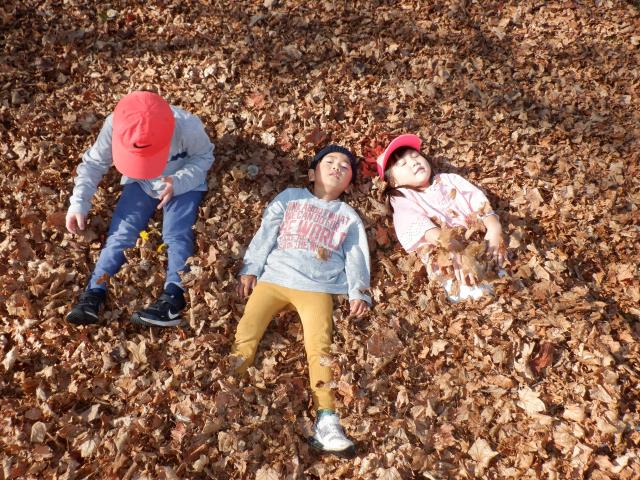 公園には落ち葉がいっぱい!寝転がったり、落ち葉のお布団をかけたりと、落ち葉まみれになりながらたくさん遊んだたんぽぽさんでした♪