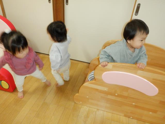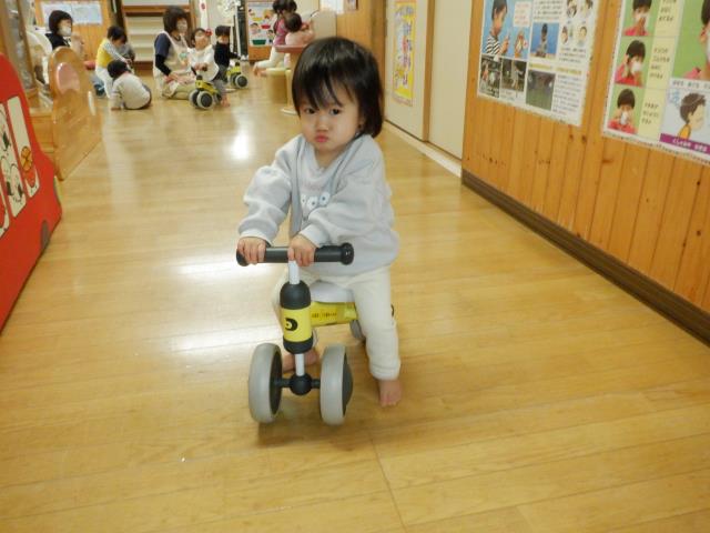 お遊戯室でちゅうりっぷさんとリズム遊びをした後、玄関ホールでデイバイクとすべり台をして遊びました。