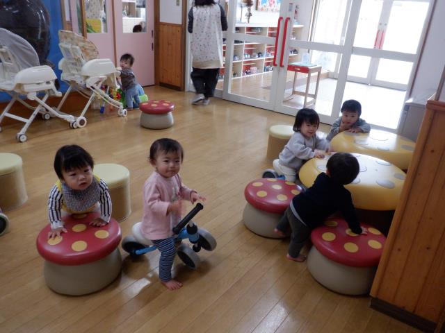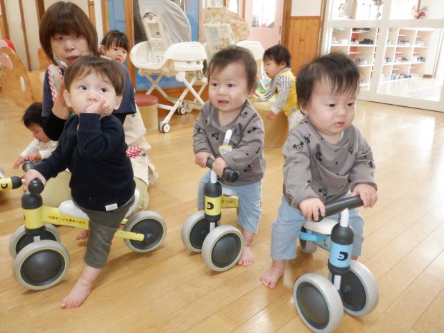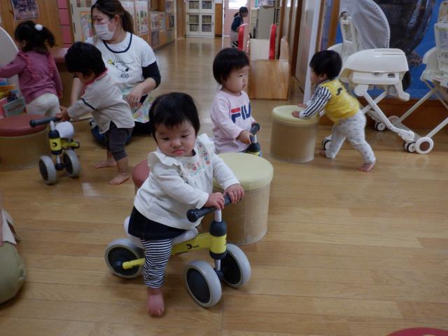 デイバイクに乗って、自分で進めるお友達も増えてきましたよ!丸椅子につかまり立ちをしてあんよをしたりと、月齢によってできることが増えてきたももさん。