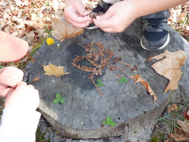 他にも、切り株の上に葉っぱや草などを飾り付けてケーキ作り、自然物を使って焼肉ごっこと、自然にふれて遊ぶことができましたよ。