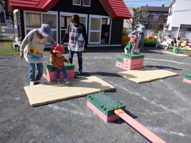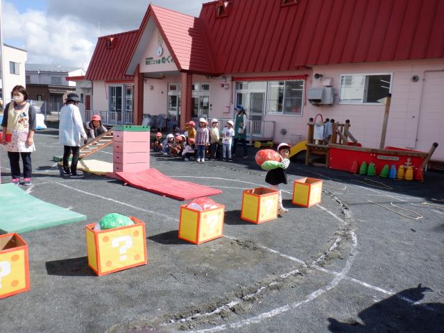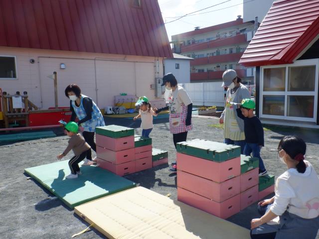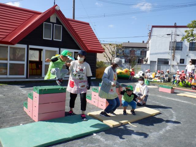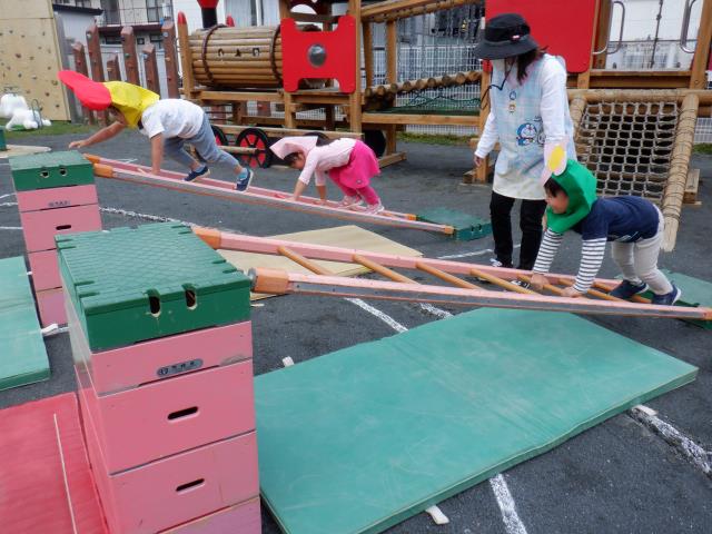 ももさんと同じくはらぺこあおむしの競技ですが、階段を上ってジャンプや、平均台も渡っちゃいますよ!