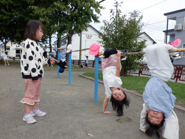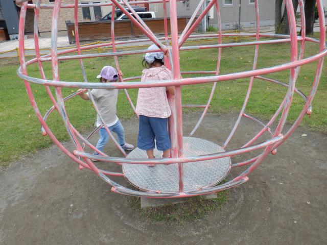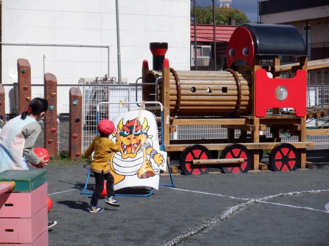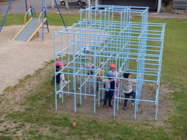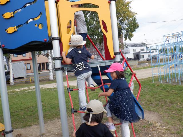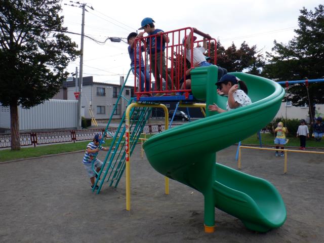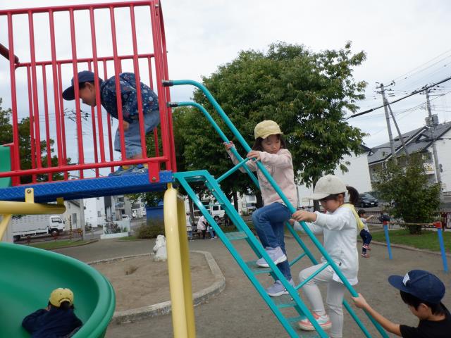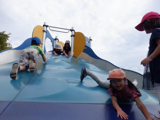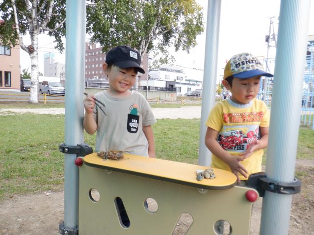 色んな遊具でもたくさん遊び、すべり台の下でお店屋さんごっこも楽しみました。ちょうちょを捕まえたお友達もいましたよ!虫かごを持って行ったので、大事に中に入れていました。