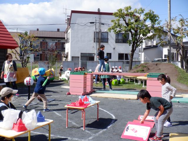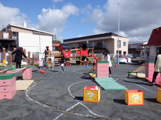 平均台やジャンプをし、サイコロを振って出た物を親子で持ってゴール!