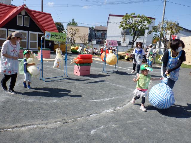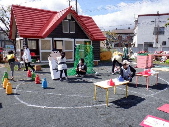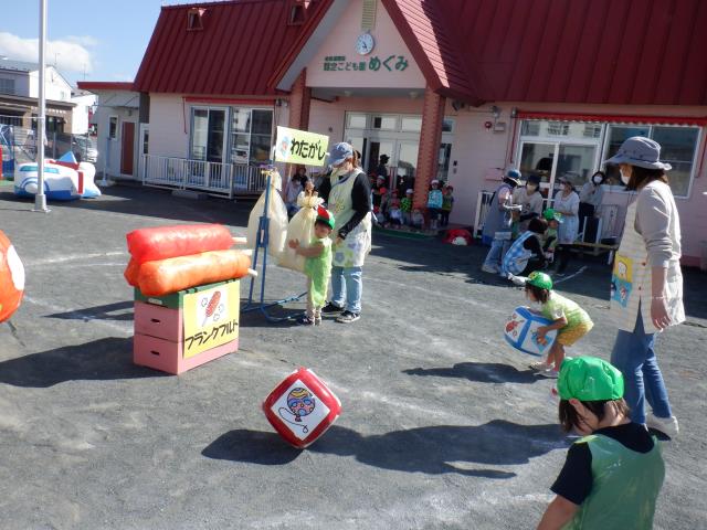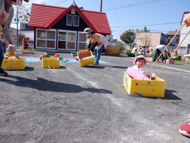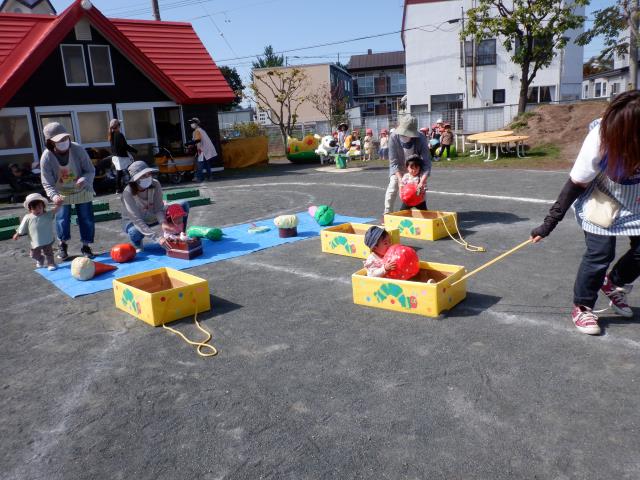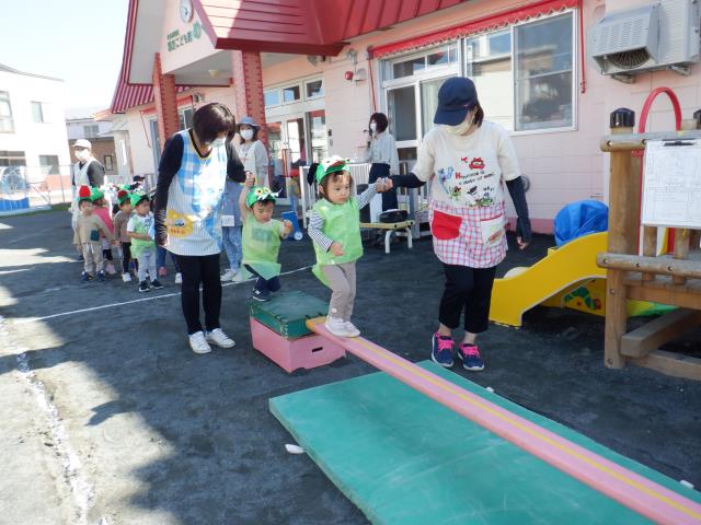 たんぽぽさんの親子競技は、絵本「わにわにのおでかけ」を題材に、ワニに変身してお祭りにおでかけ♪