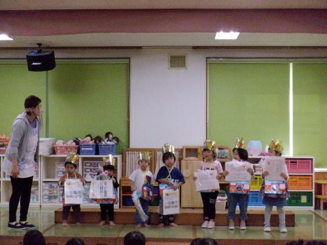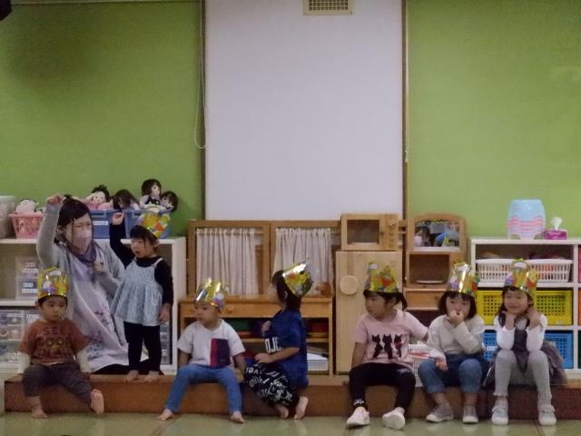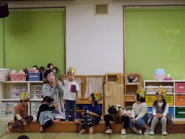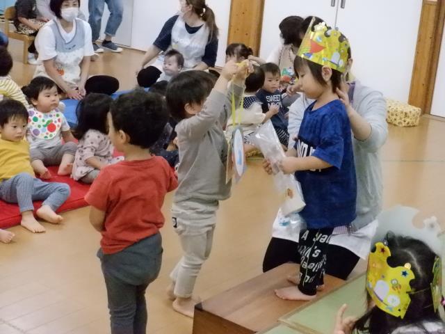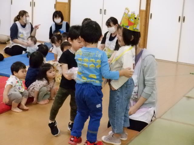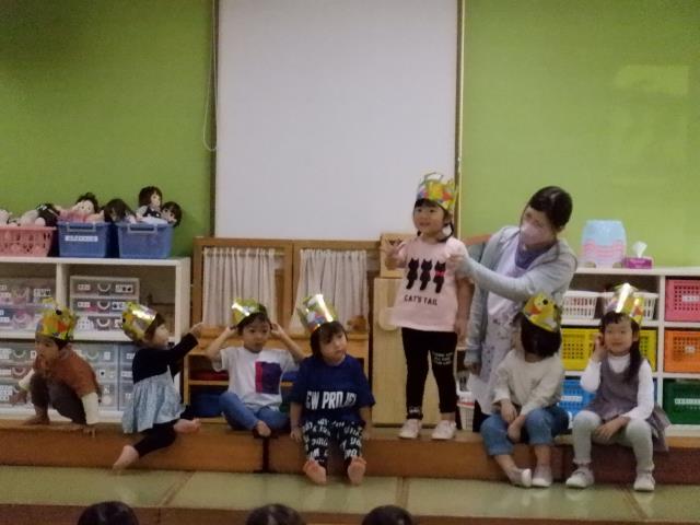 今回のお誕生会は入れ替えをして、最初にもも組・ちゅうりっぷ組・たんぽぽ組・さくら組のお友達をお祝いしましたよ。