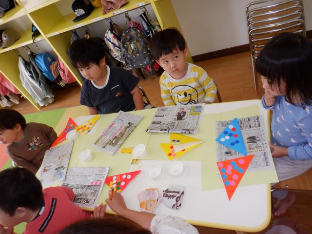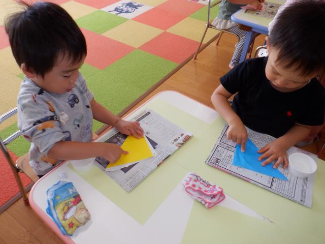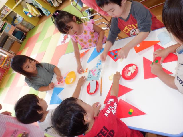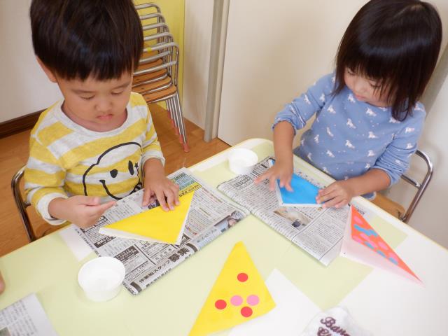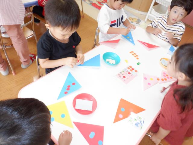 好きな色の折り紙を選び、三角に折りましたよ。丸シールでキノコに模様を付けて、台紙にのり付けして貼りました。