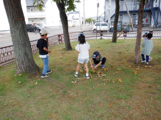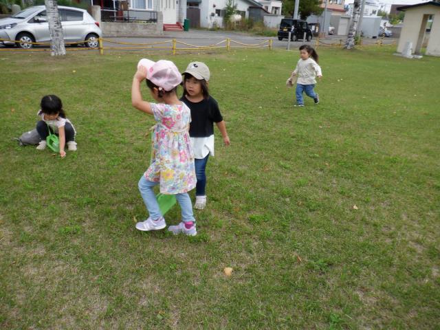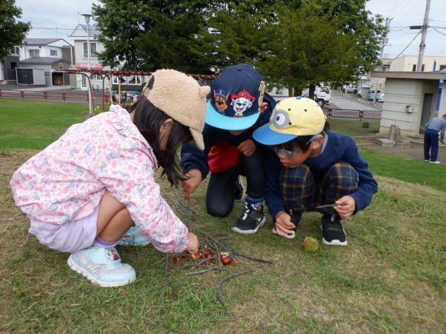 公園には、ちょうど栗がたくさん落ちていてみんなで栗拾い!たくさん拾うことができました。栗を集めて、栗ご飯作りをしているお友達もいましたよ。