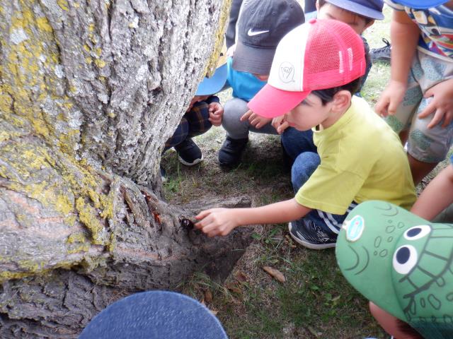 ゆりさんがカブトムシを放すところをみんなで見て、お別れをしてきました。元気に木を登っていって一安心。元気でね!