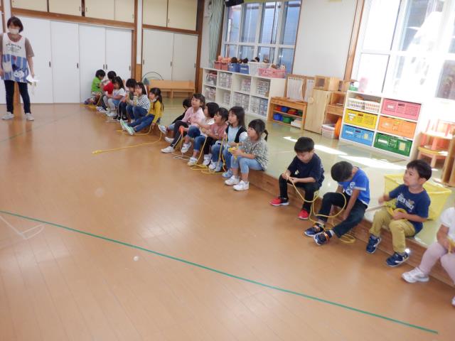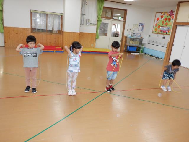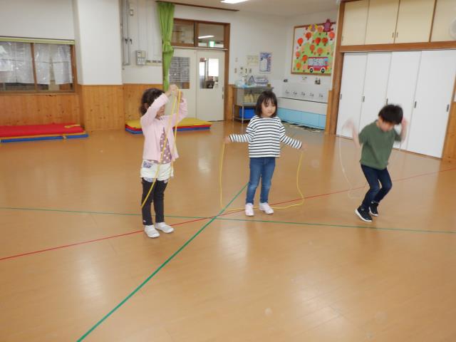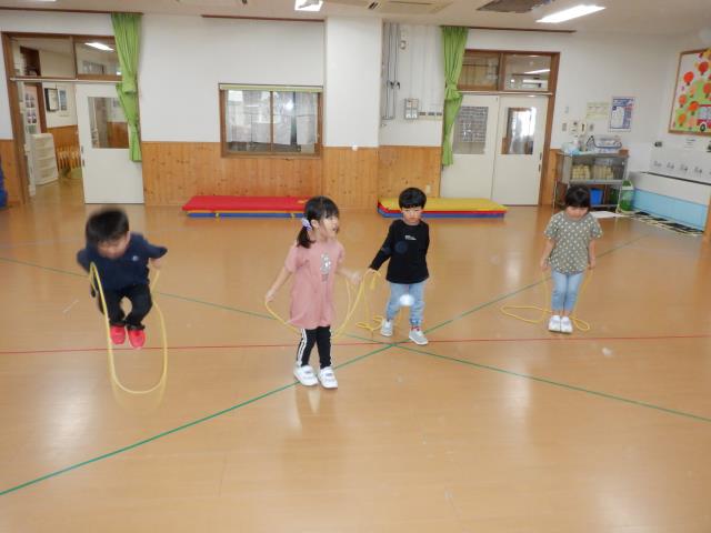 すみれさん、遊戯室で縄跳び練習!少しずつ跳べるようになり、お友達に教えてあげる姿もみられました。