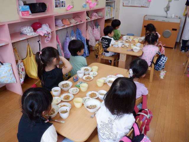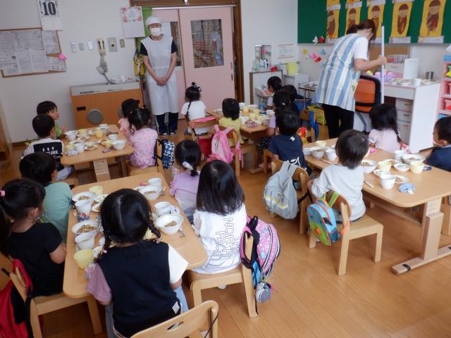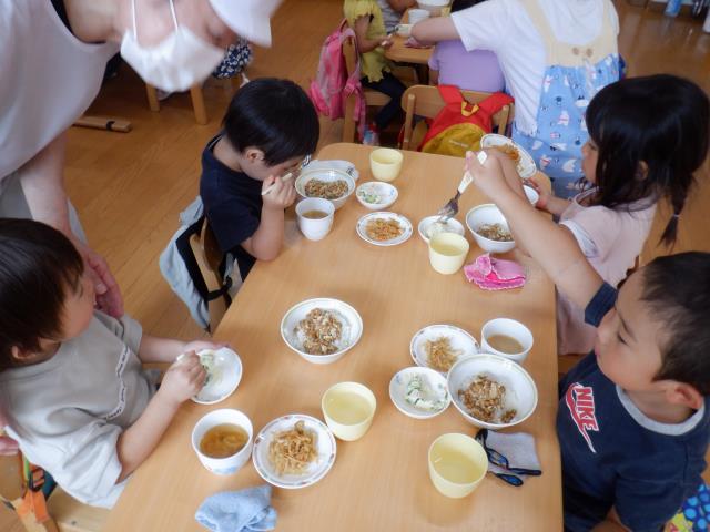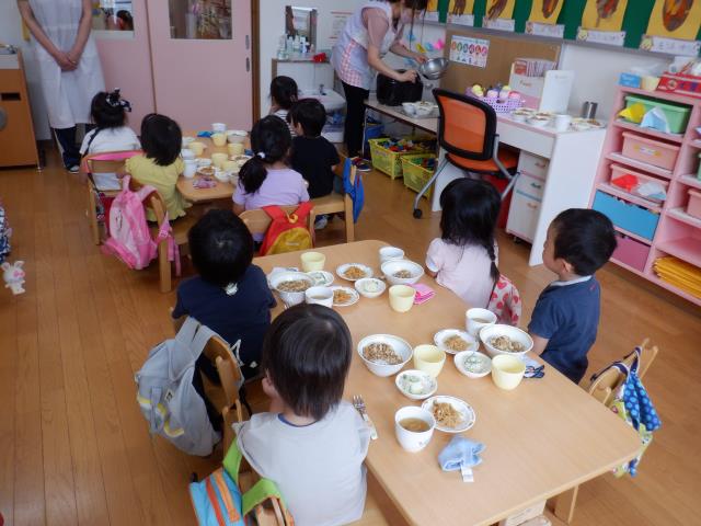 給食先生から食育指導として、三角食べをすることでお腹の中にもバランス良く入っていくよというお話や、切り干し大根は何でできているかな?というお話を聞きました。一人ひとりフォークの持ち方も見てもらい、美味しく給食を食べていたさくらさんでした!