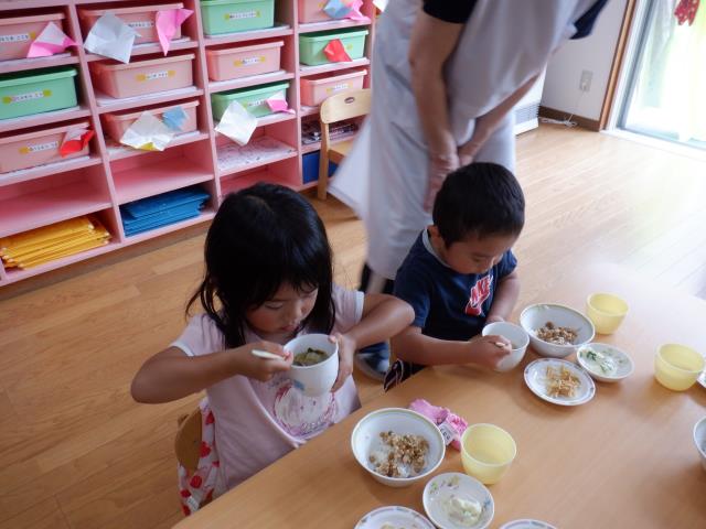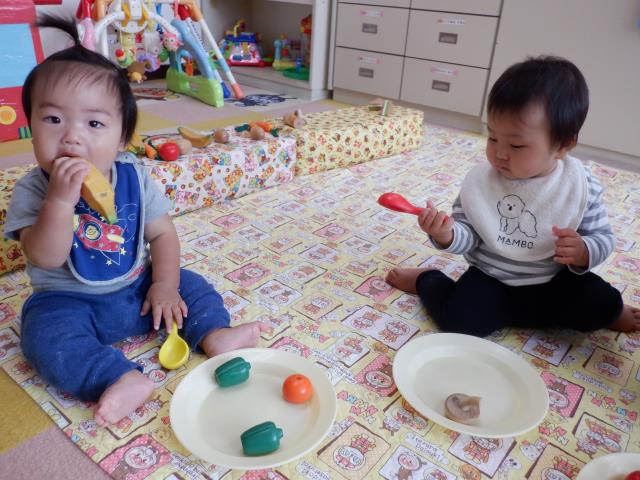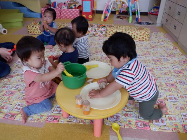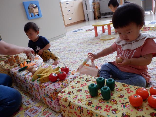 お買い物をした食材を使ってお料理ごっこ♪お鍋の中でまぜまぜしたり、夢中で食べる姿もみられましたよ。