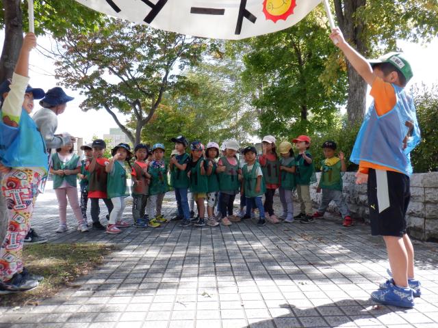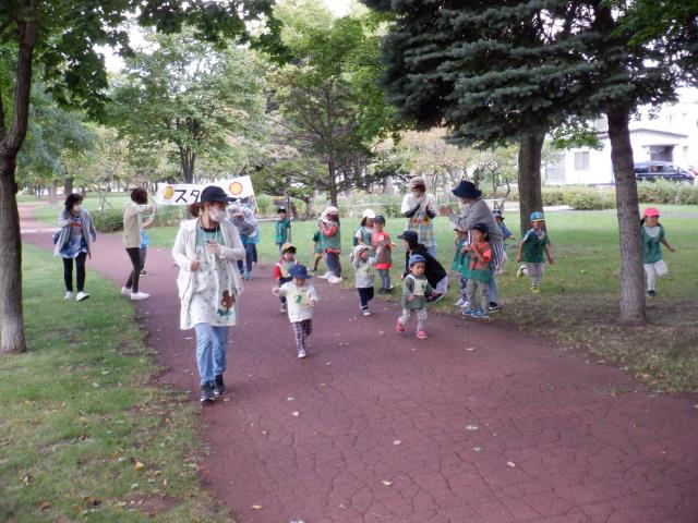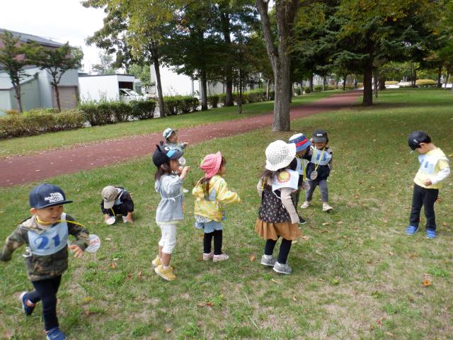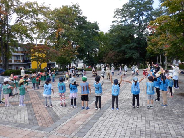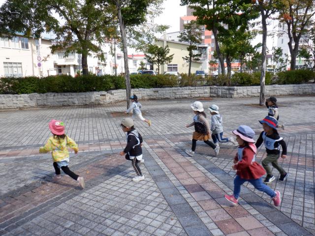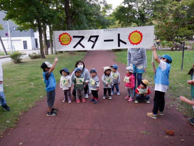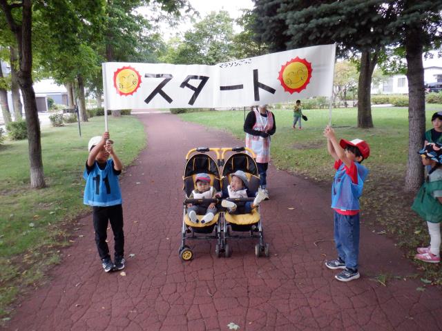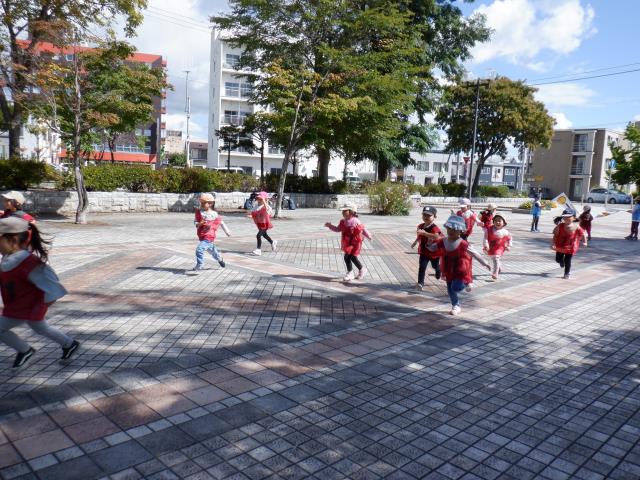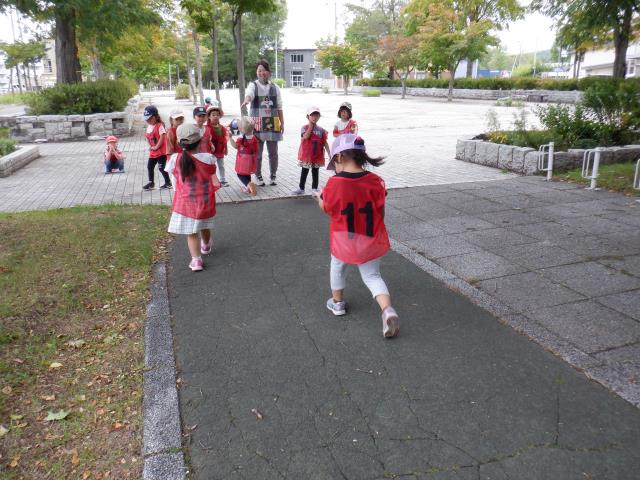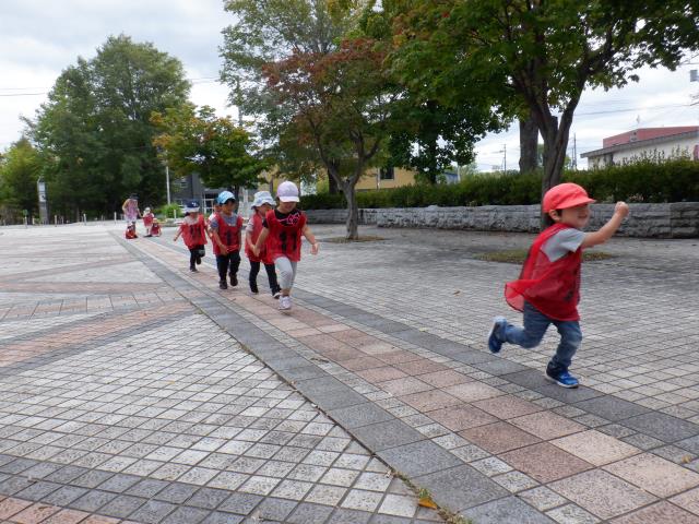 今日は秋晴れの中、遊歩道でマラソンごっこがありました。