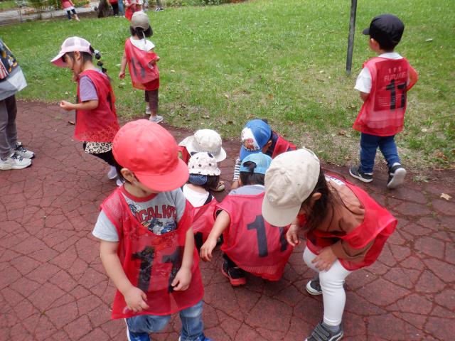 小さいクラスから順によーいドン!みんな上手に走っていましたよ。たんぽぽさんは、転んだお友達も泣かずに最後まで頑張りました!